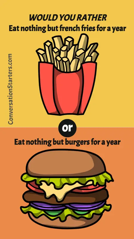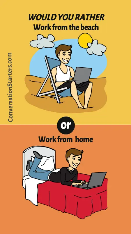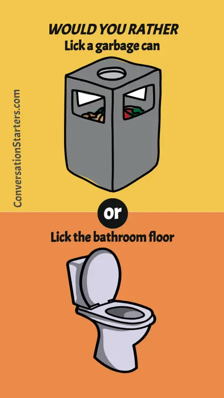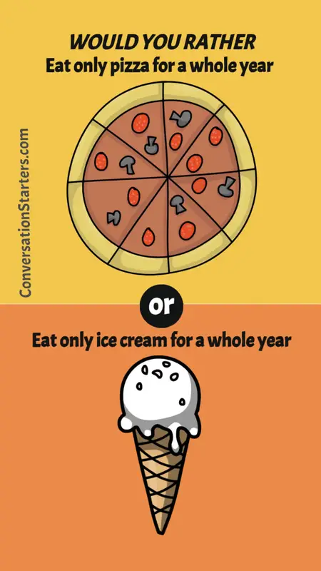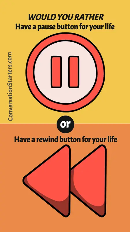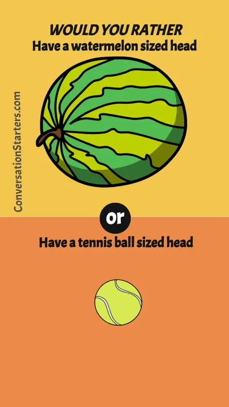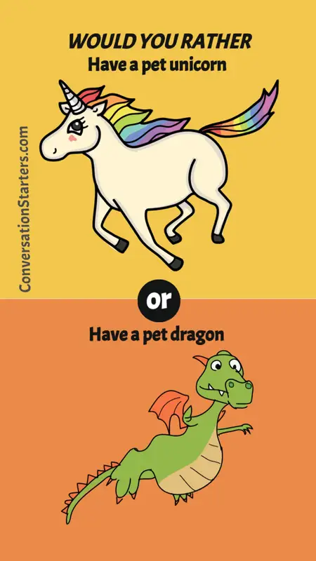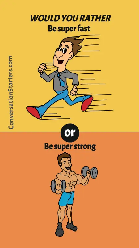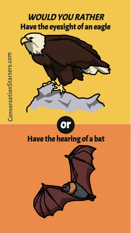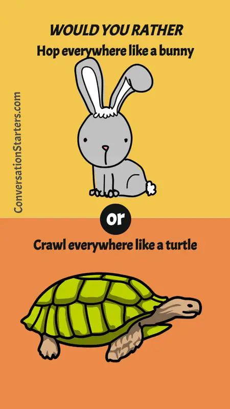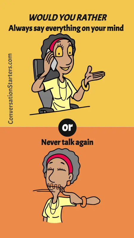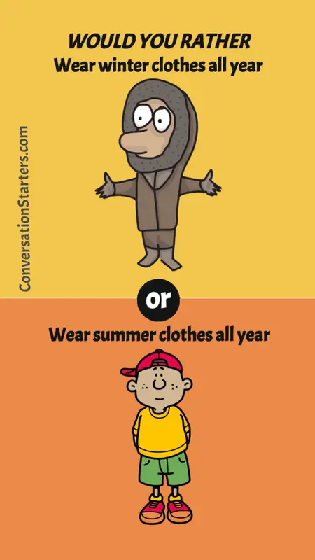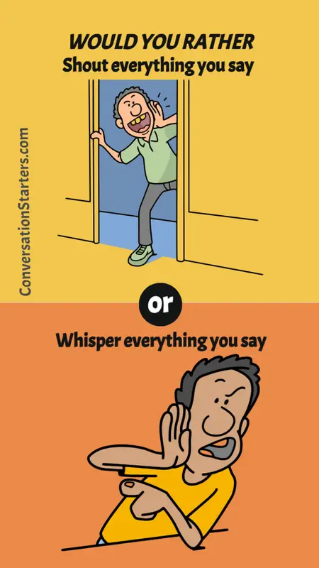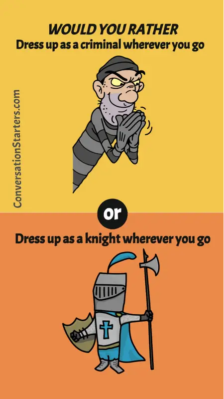 Get ready for lots of fun with our interactive slider featuring pictures of Would You Rather questions! Packed with funny, intriguing, and thought-provoking dilemmas, there's something for everyone, kids and adults alike. Simply click the arrows on either side of the image to explore the next question and keep the excitement going!