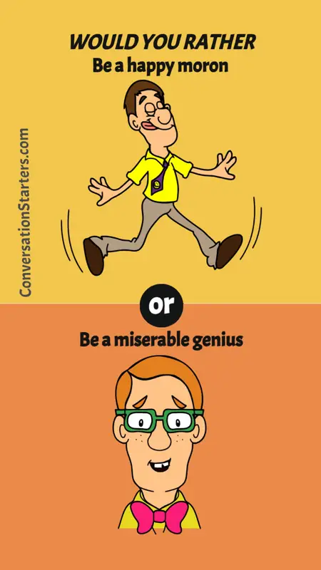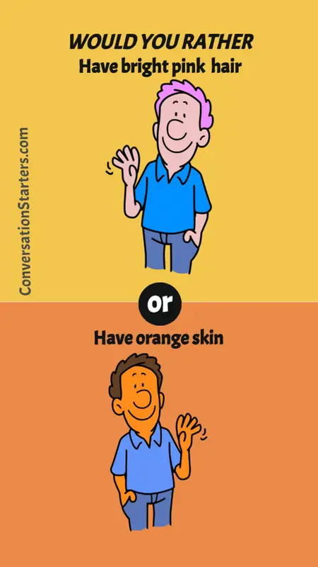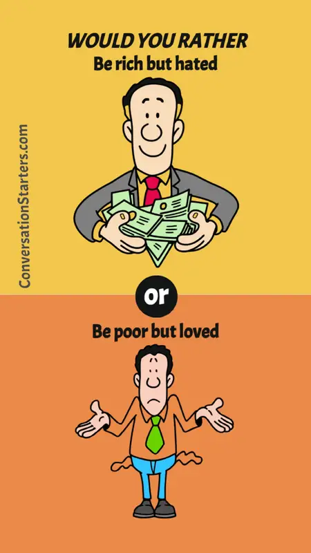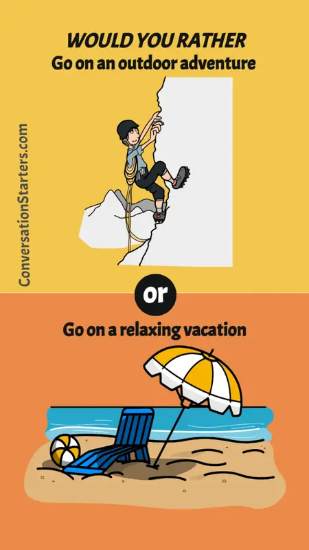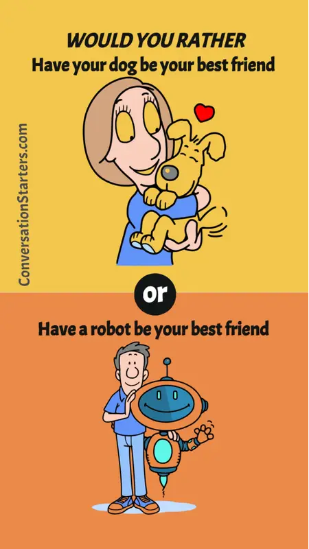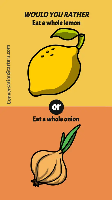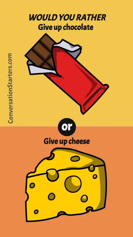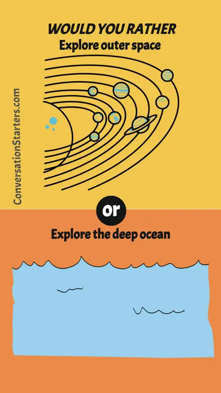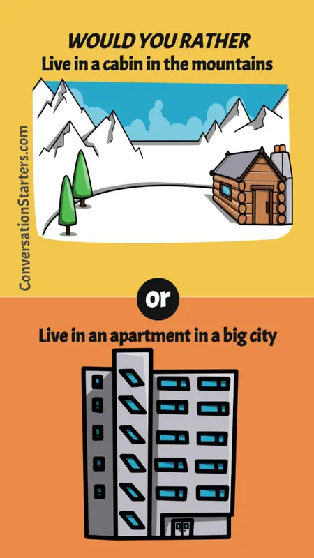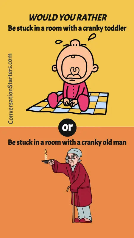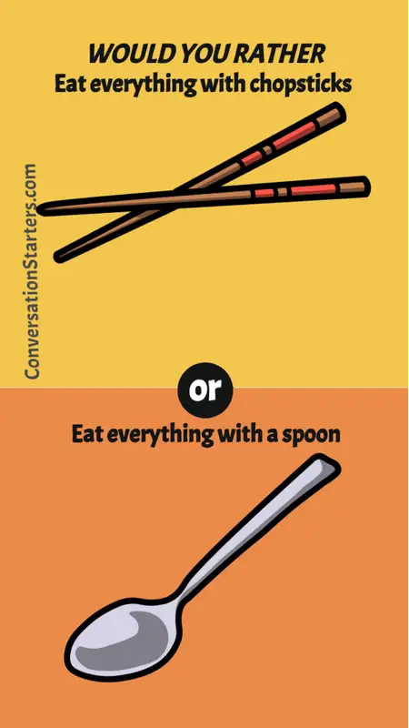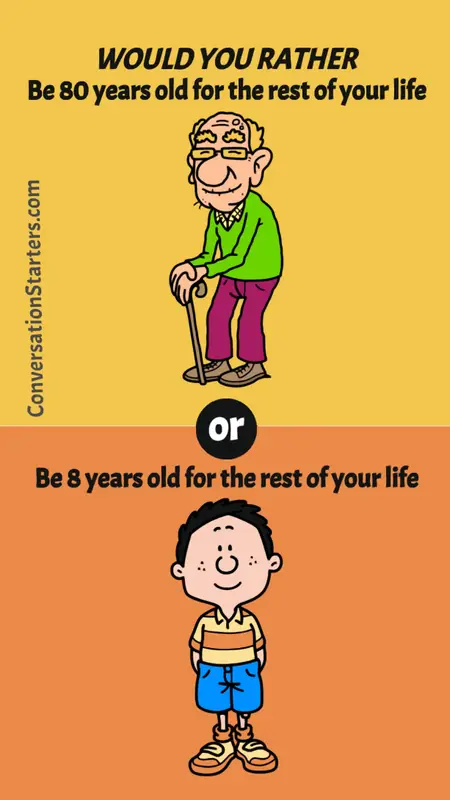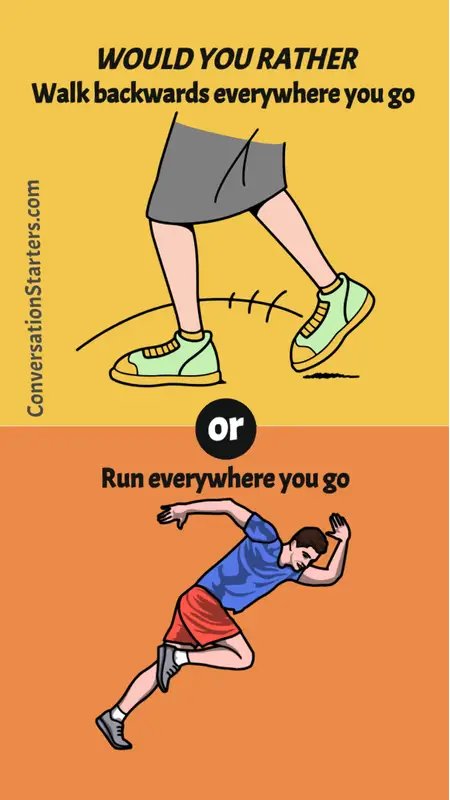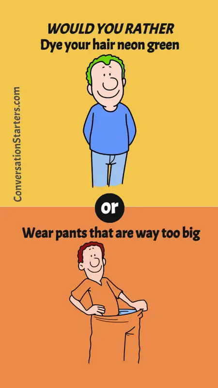 Get ready for lots of fun with our interactive slider featuring pictures of Would You Rather questions! Packed with funny, intriguing, and thought-provoking dilemmas, there's something for everyone, kids and adults alike. Simply click the arrows on either side of the image to explore the next question and keep the excitement going!