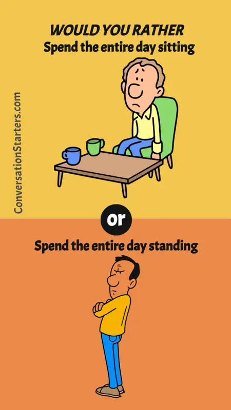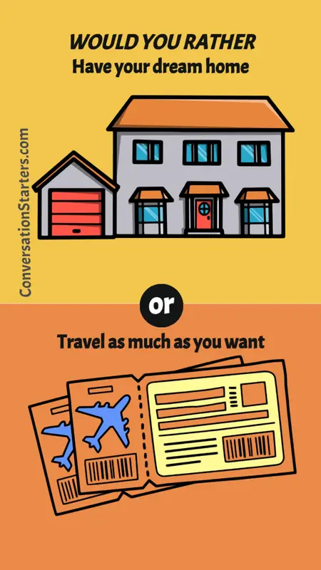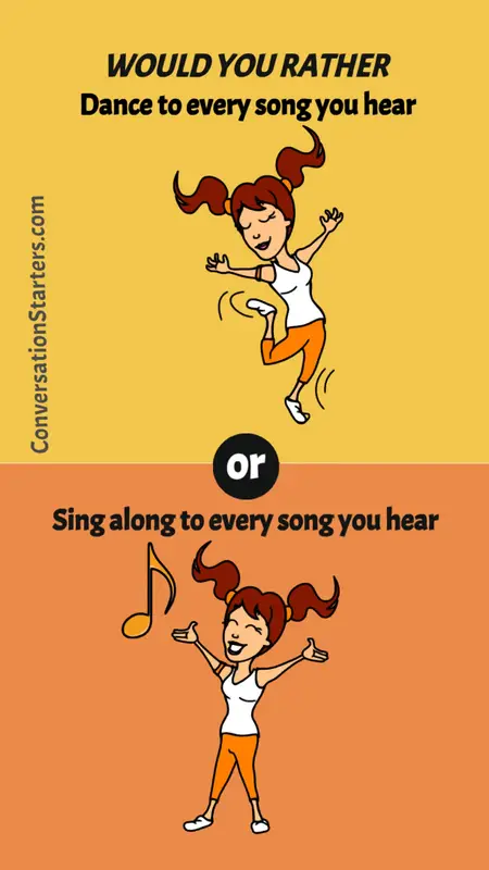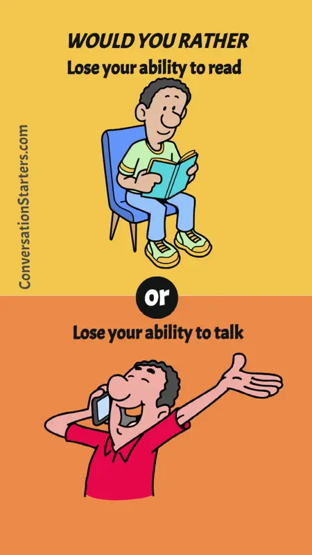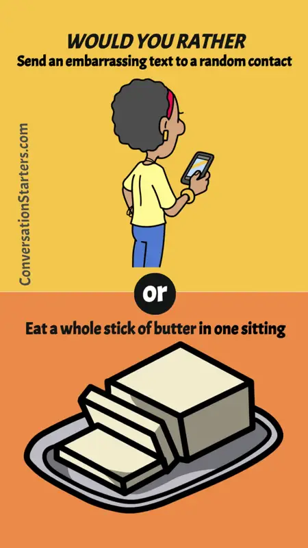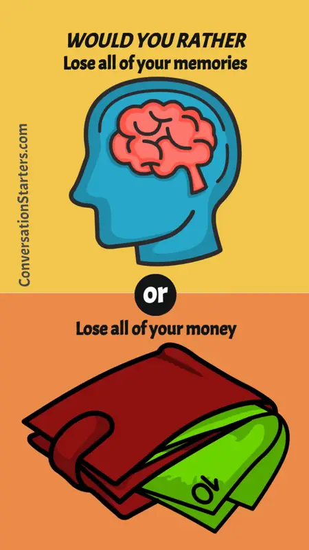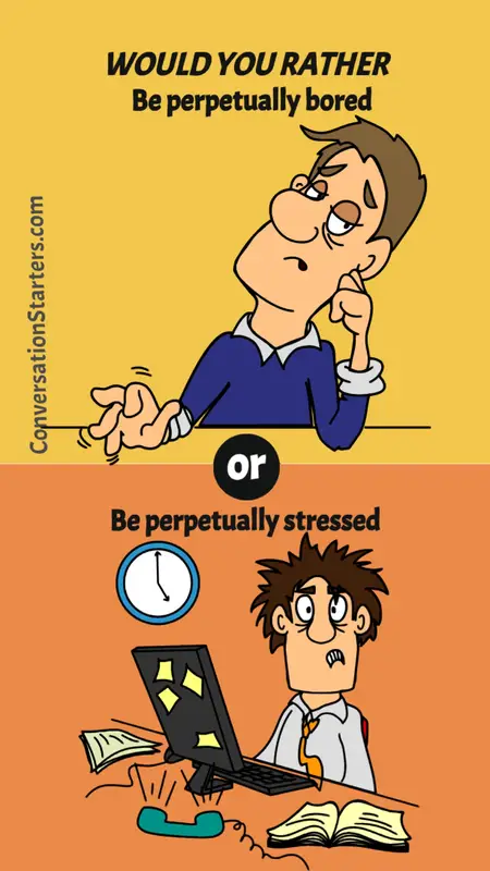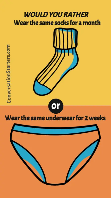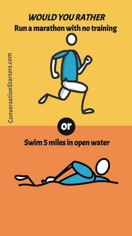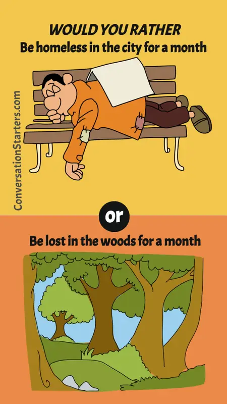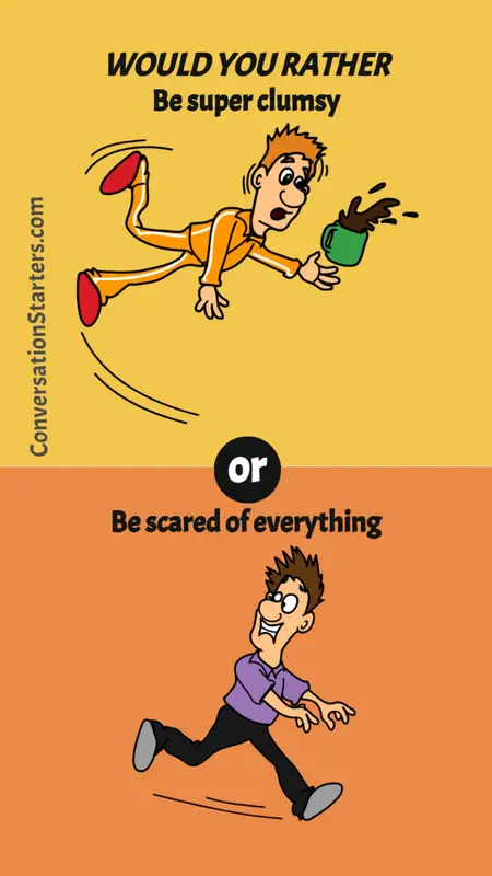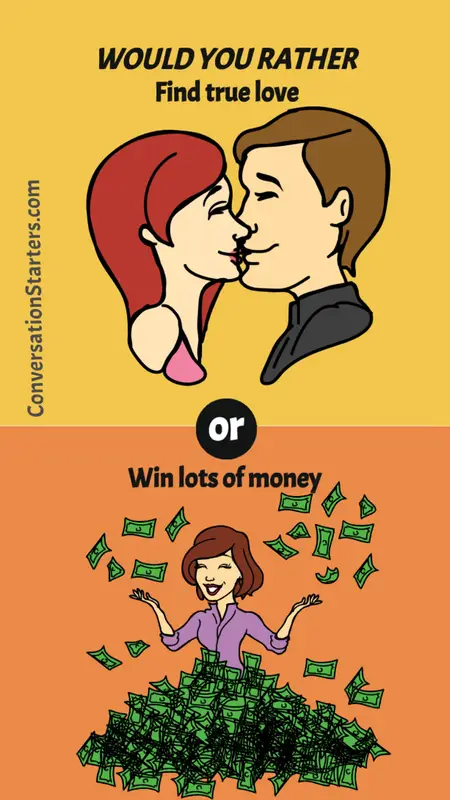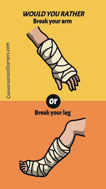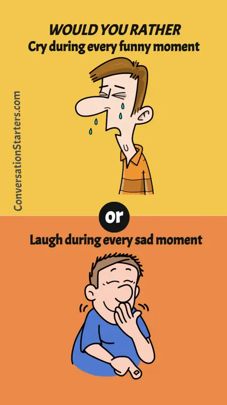 Get ready for lots of fun with our interactive slider featuring pictures of Would You Rather questions! Packed with funny, intriguing, and thought-provoking dilemmas, there's something for everyone, kids and adults alike. Simply click the arrows on either side of the image to explore the next question and keep the excitement going!