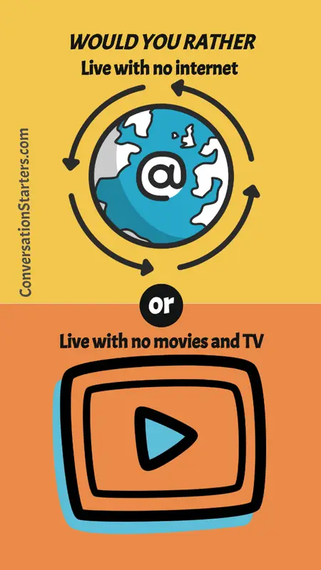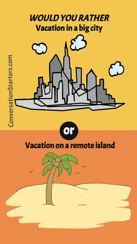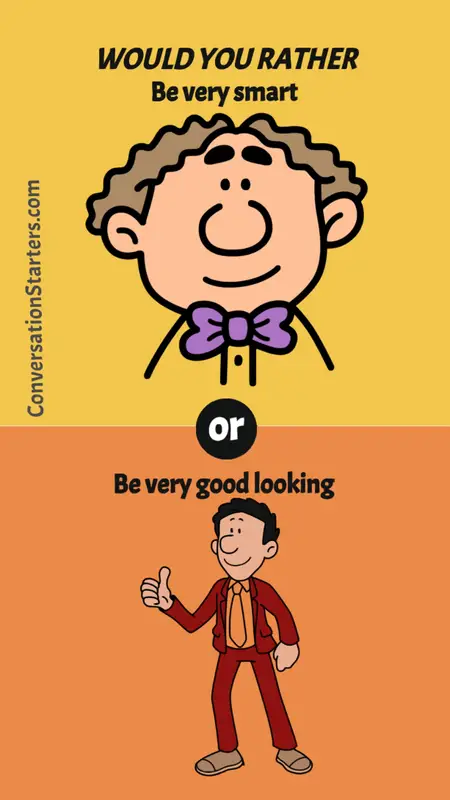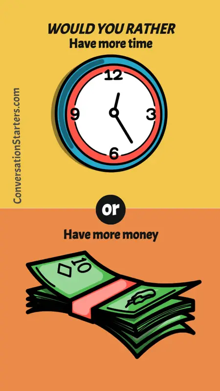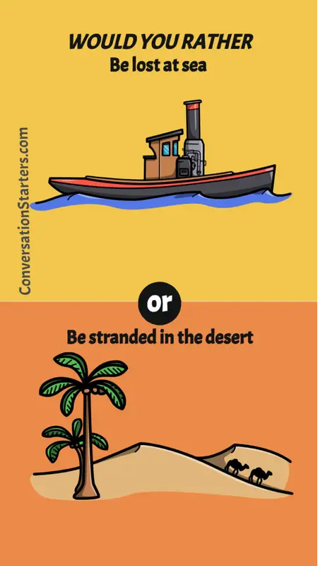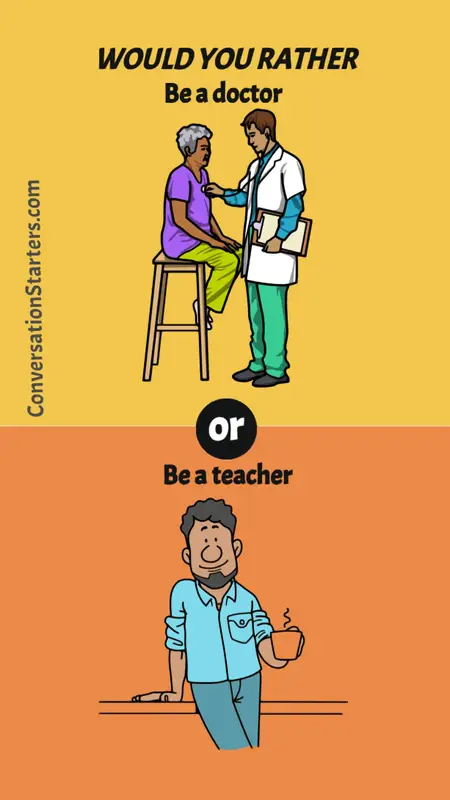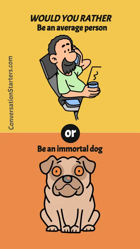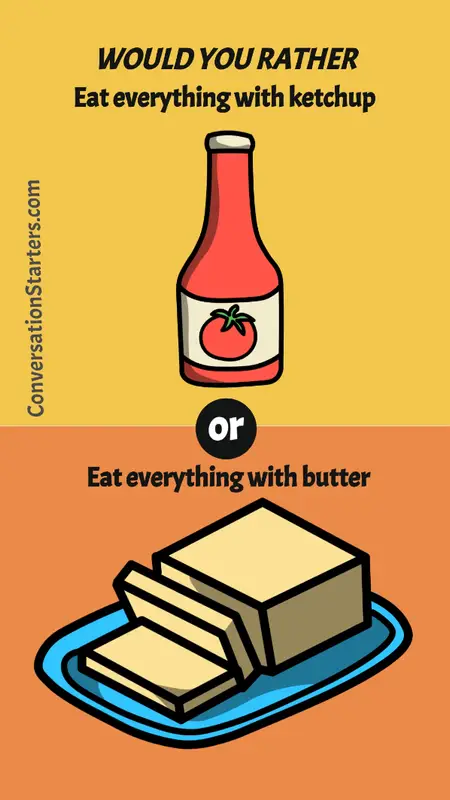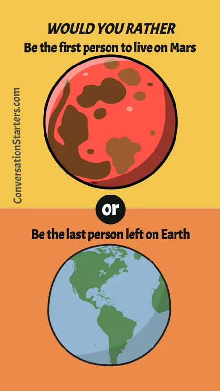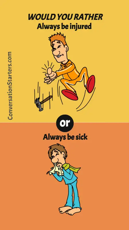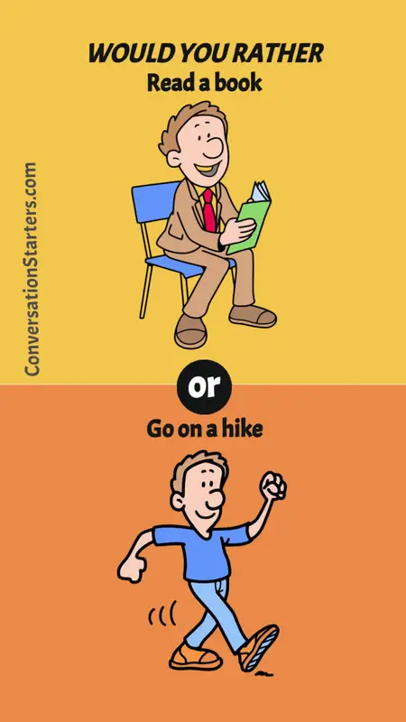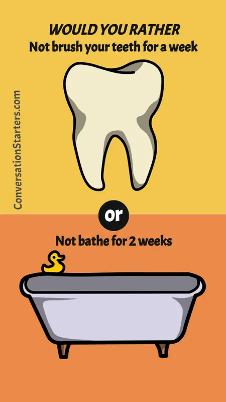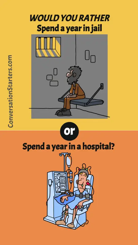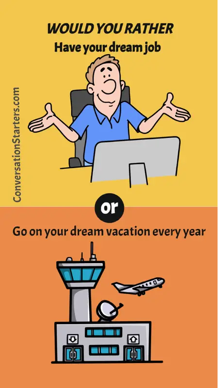Get ready for lots of fun with our interactive slider featuring pictures of Would You Rather questions! Packed with funny, intriguing, and thought-provoking dilemmas, there's something for everyone, kids and adults alike. Simply click the arrows on either side of the image to explore the next question and keep the excitement going!